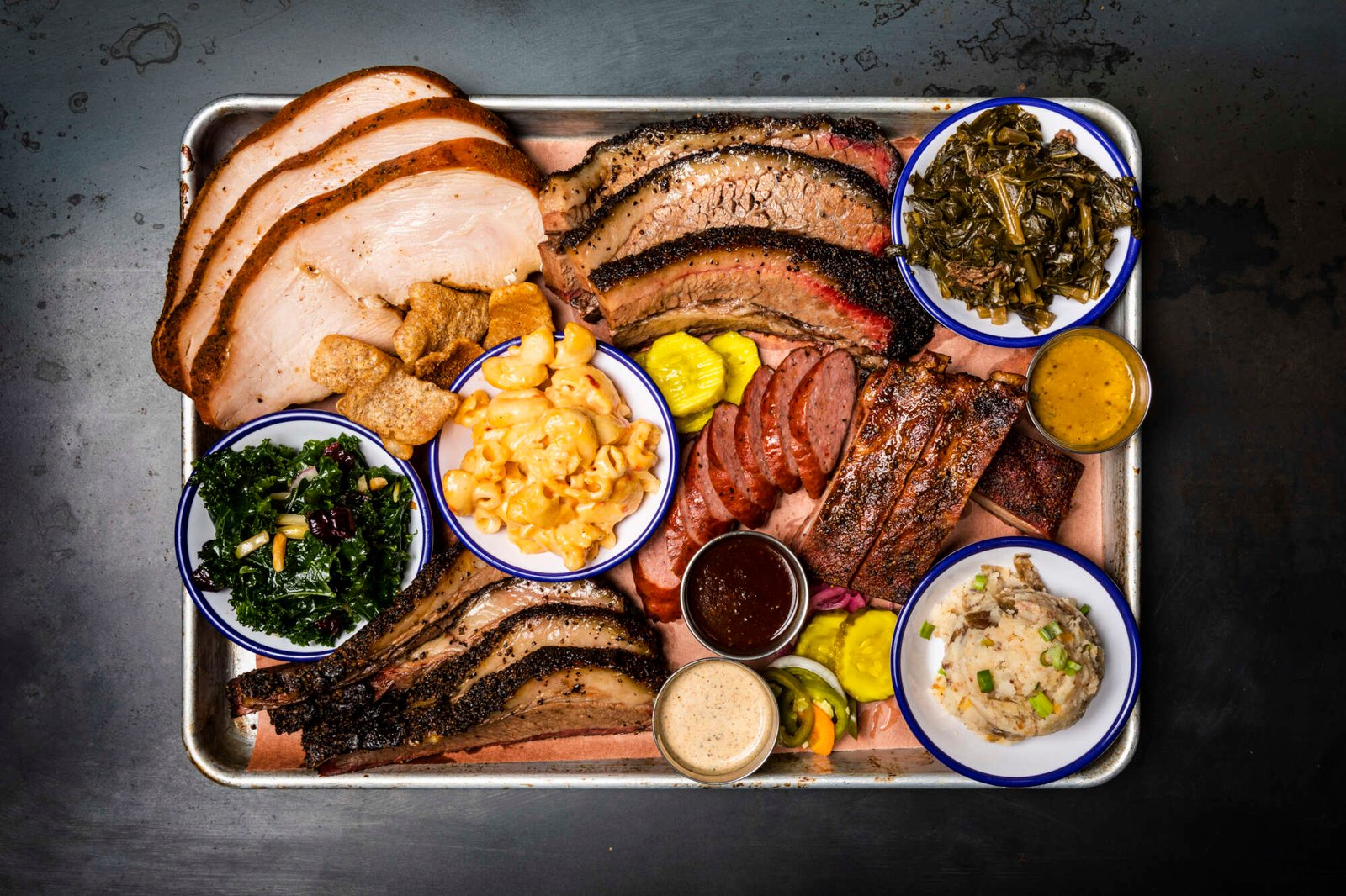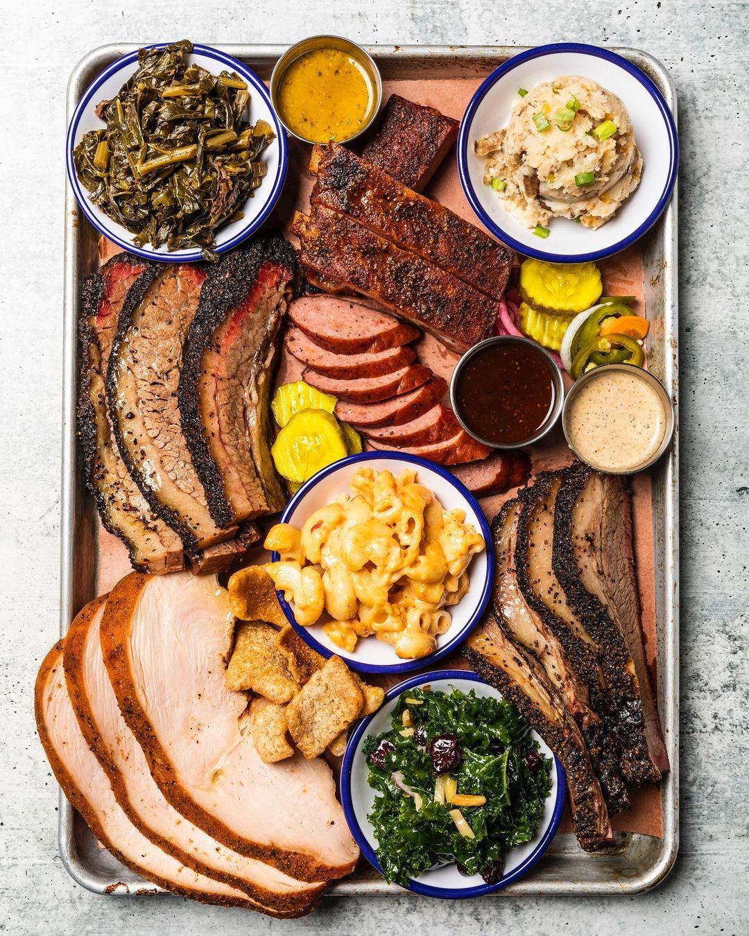 Feges BBQ is known for its delicious variety of meats and sides. Must-try dishes include the brisket, fried pork ribs, and whole hog BBQ. For sides, don’t miss the Brussels sprouts, elote salad, and cranberry orange burnt ends.