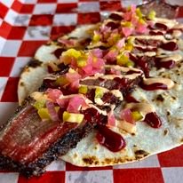 Customers rave about the brisket, brisket Frito pie, and the hog wild taco. The daily specials and sides like hatch chili mac & cheese and peach hand pies are also popular choices.